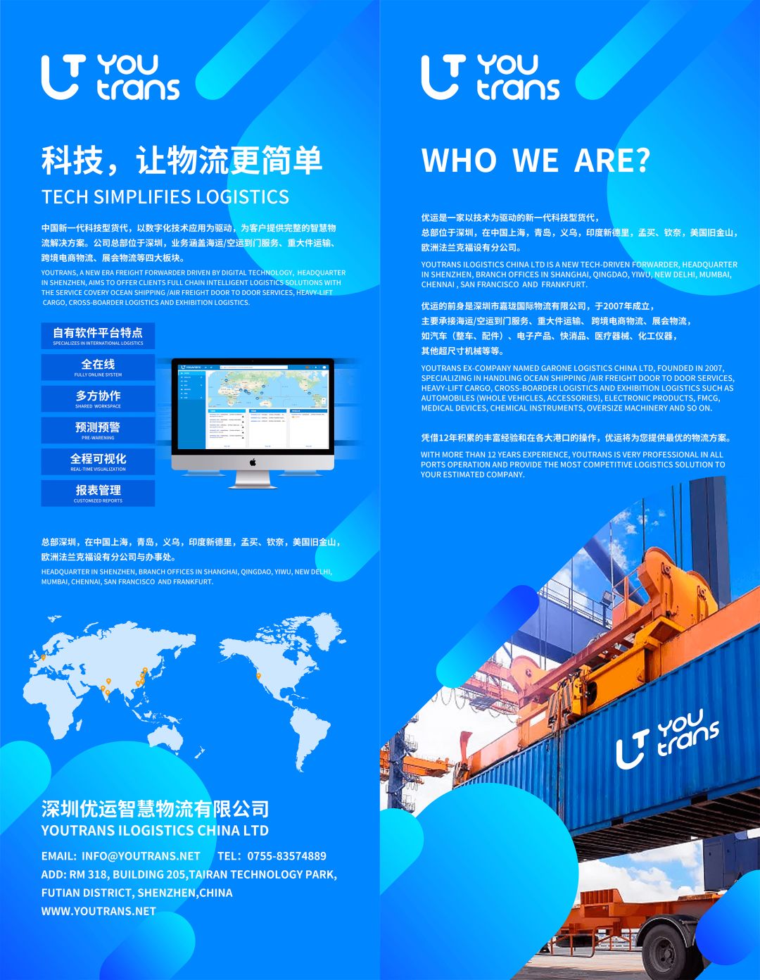 YouTrans拥有超过12年的 全球门到门物流服务经验,在中国深圳、上海、青岛、义乌,印度新德里、孟买、钦奈,美国旧金山,欧洲法兰克福等地设有分支机构,业务范围通达全球100多个国家。