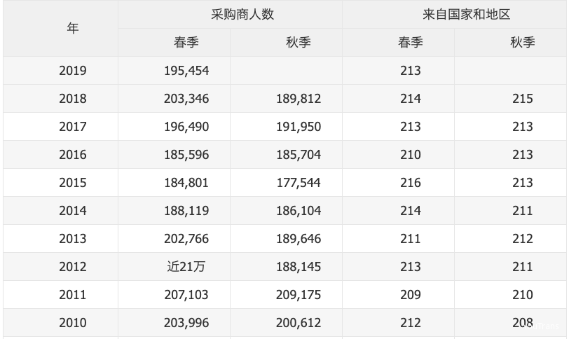 据统计,近几年来,每届广交会都吸引了来自200多个国家和地 区的近20万采购商参展,每次成交总额在300亿美元左右。第126届广交会 更是 吸引了来自 电子及家电、照明、车辆及配件、机械、五金工具、建材、化工产品、新能源、 日用消费品、 医药及医疗保健、食品等行业的数万家企业参展。 相信此次广交会给各位参展商带来不少新的合作!